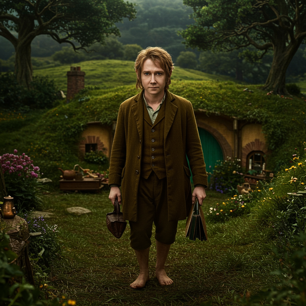 Bilbo :: Hobbiton journey, Middle-earth saga, vibrant ultra-wide shot, hyper-realistic, sophisticated studio lighting, captured with a Hasselblad, ISO 64, 8K resolution, evoking the essence of Diego Rivera's murals, photographed by Annie Leibovitz --ar 2:3 --q 2 --v 5 --s 750