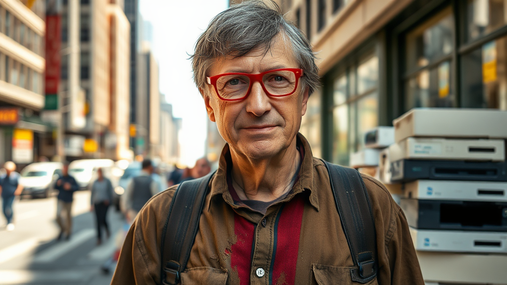 Bill Gates standing on a bustling city street, appearing as a homeless man with untidy hair and weathered red glasses held together with tape. His clothes are aged, torn, and dirty, riddled with holes. The sunlight casts a sharp glow, highlighting the contrast in his appearance. Next to him, a scattered pile of old, obsolete computers and printers is stacked haphazardly. The image is captured with a Canon EOS Rebel SL2 using an EF100mm, f/2.8L Macro IS USM lens at 100mm, f/2.8, 1/1000 shutter speed, and ISO 100, bringing out the details of this striking scene.