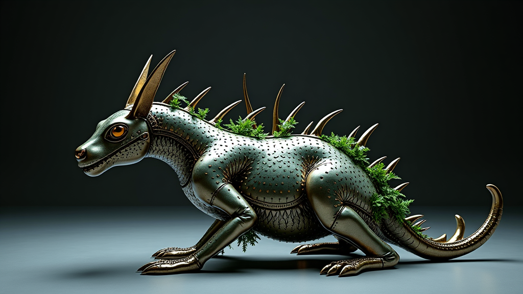 A futuristic biomimetic chair seamlessly blending technology and nature emerges, its design inspired by the sleek contours and dynamic forms of animal shapes. This creation stands as a testament to innovation in a dystopian world, where metallic hues intermingle with organic textures. Its frame mimics the agile stance of a predator, suggesting both elegance and latent power. The chair's surface, a mosaic of iridescent scales, reflects dim ambient light, adding a mysterious allure. Vines and foliage subtly entwine in its structure, hinting at a reclaimed symbiosis with the natural world. This piece serves as both a functional object and an avant-garde sculpture, epitomizing the fragile balance between human advancement and the untamed wilderness.