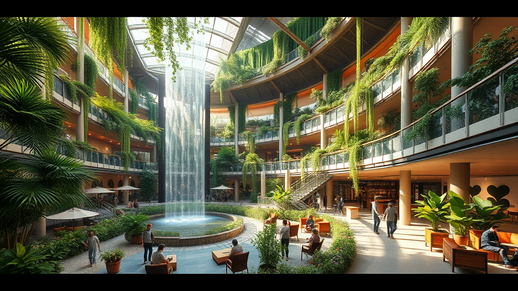 Biophilic-inspired public space featuring an expansive atrium with an impressive indoor waterfall, lush greenery throughout, and seamless integration with nature; crafted with photorealistic CGI using Unreal Engine. The design is highlighted by verdant elements and advanced rendering techniques to bring a lifelike environment to life, ensuring a captivating experience.
