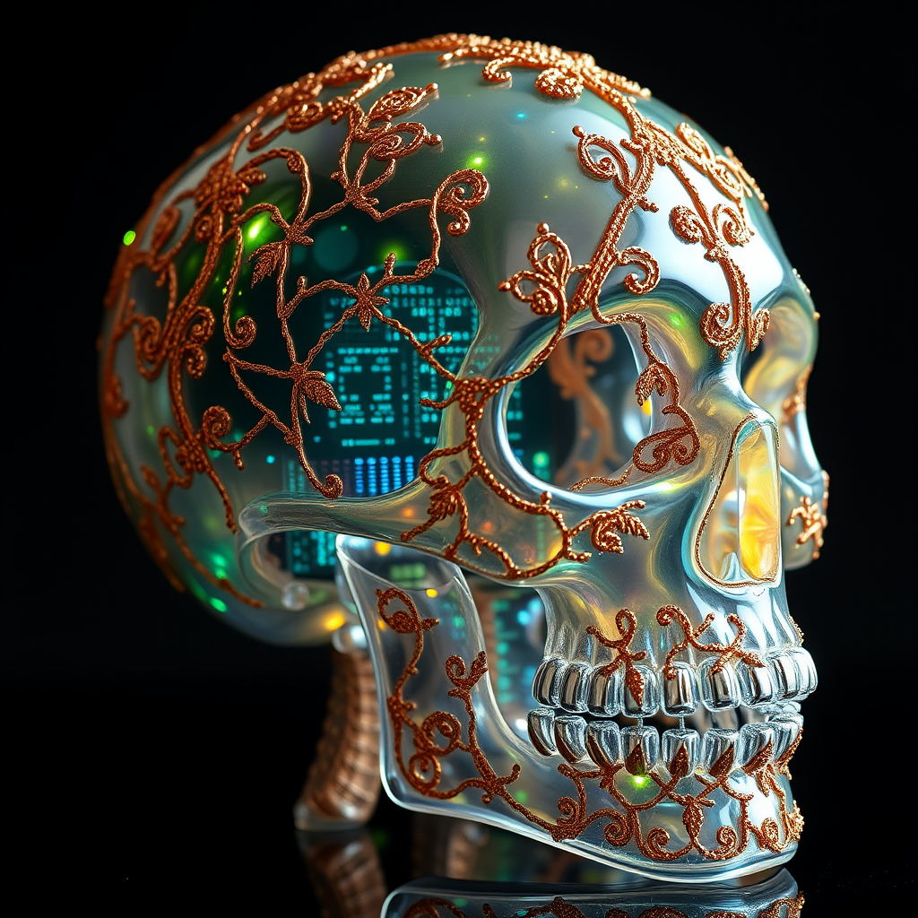 Bioresponsive polymorphic celebrity skull figurine, intricately crafted from glittering chrysotile mesh and rose gold filigree, transparent iridescent scales shifting to display fractal algorithms on the surface, containing a radiant plasma that absorbs and reflects external audio frequencies, giving the facade a mesmerizingly changing glow, while its processor core, visible through the transparent exoskeleton, pulses with jazzy micro-processing flashes evoking an otherworldly joie de vivre, created by tetsuya takagi