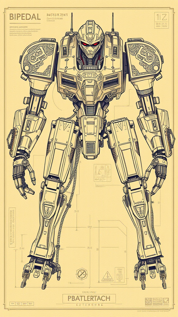 Bipedal mech blueprint concept art, featuring a center frame with intricate and ultra-detailed design elements in a baroque style, showcasing a desaturated color palette. Inspired by Battletech, Mechwarrior, and Gundam aesthetics, the mech displays articulated limbs with complex joint mechanisms, armored plating with ornate engravings, and a sophisticated control cockpit. The headpiece integrates advanced sensor arrays, while the torso reveals a fusion power core with energy conduits. The legs are engineered for optimal balance and agility, incorporating retractable stabilizers. Minor creative modifications include an asymmetrical arm design with an integrated weapon system and a modular backpack for additional equipment or propulsion options. Rendered in a 9:16 aspect ratio.
