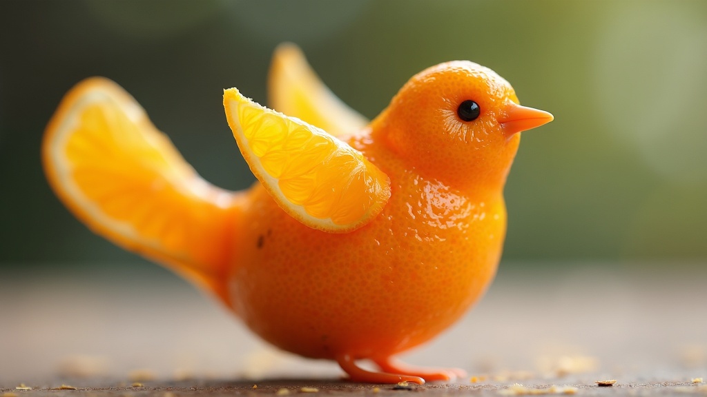 A small bird crafted from a freshly sliced orange, displaying vibrant textures with a realistic touch, wings made from peeled segments and a gleaming citrus beak, set against a softly blurred background, accentuating its vivid colors and intricate details, maintaining a whimsical yet lifelike appearance.
