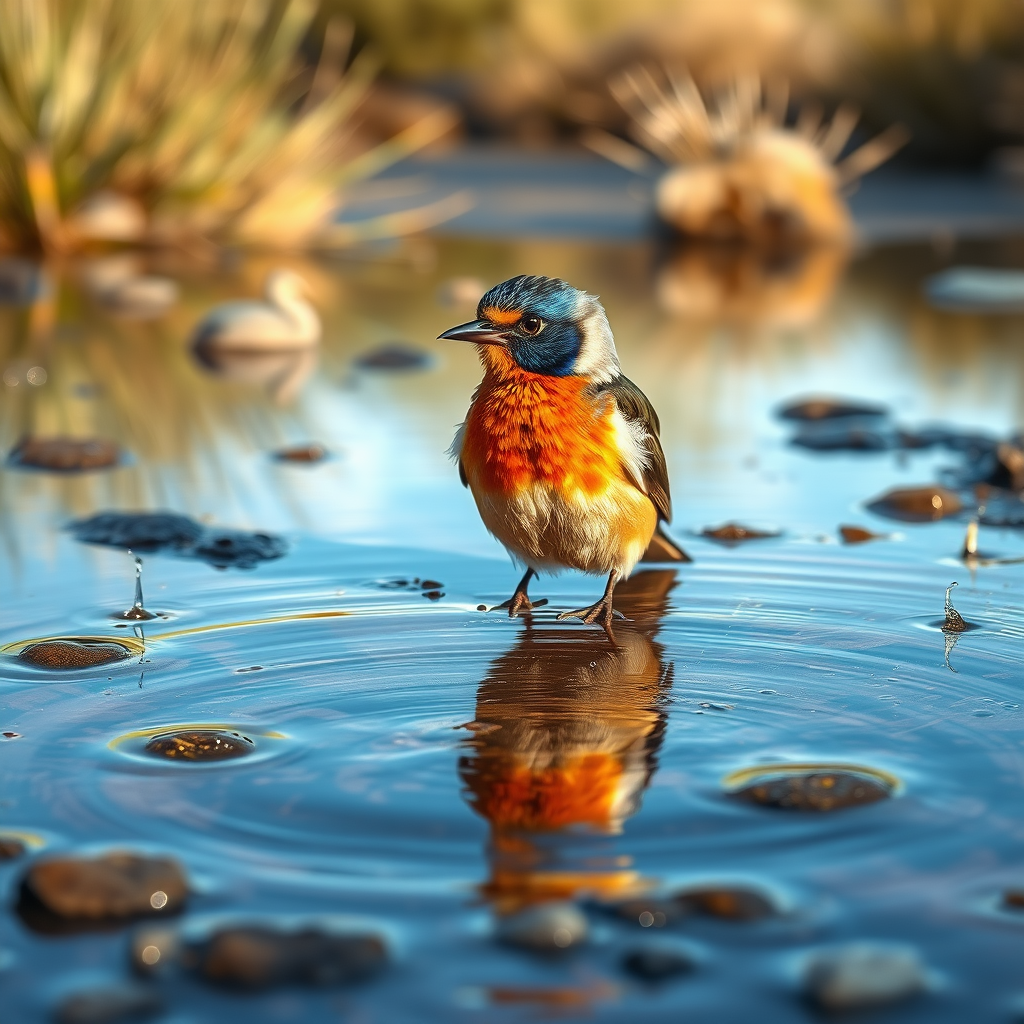 bird enjoying a refreshing drink amidst a serene landscape, vibrant colors enhancing the scene, exquisite detail on feathers and surroundings, emphasis on natural beauty and tranquility, subtle play of light and shadow, harmonious ambiance with nature