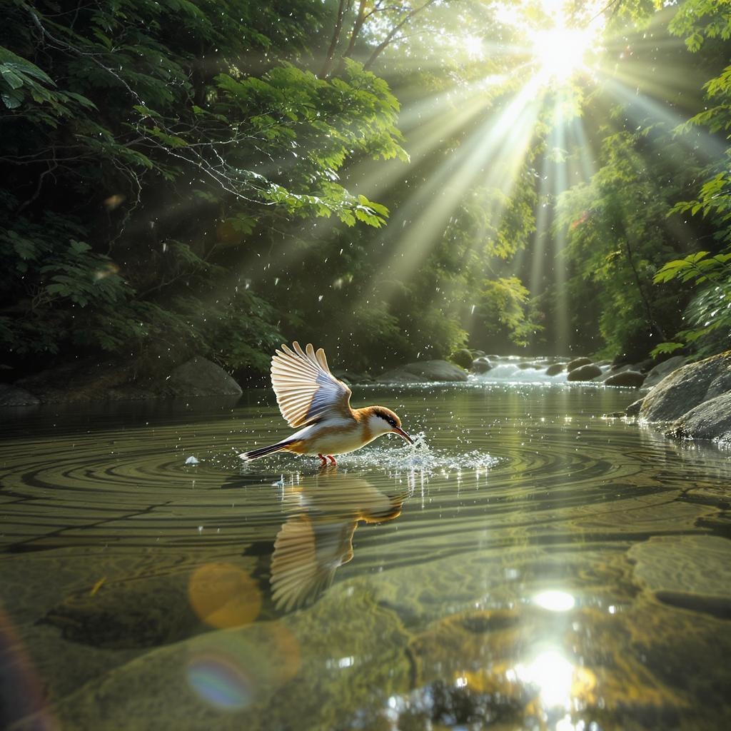 bird sipping pure water serene-landscape vibrant-colors detailed-feathers peaceful-atmosphere harmonious-nature majestic-flight gentle-breeze lush-greenery sparkling-stream sunlight-filtering-through-trees graceful-motion captivating-beauty untouched-wilderness tranquility