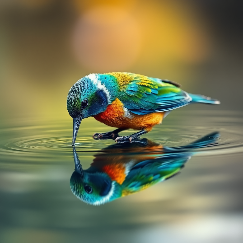 Bird sipping water, serene atmosphere, vivid colors, artistic focus on detail, vibrant feathers in contrast with a calm background, emphasis on natural beauty, harmony in nature, realistic depiction with an artistic twist, gentle ambiance, captivating scene.