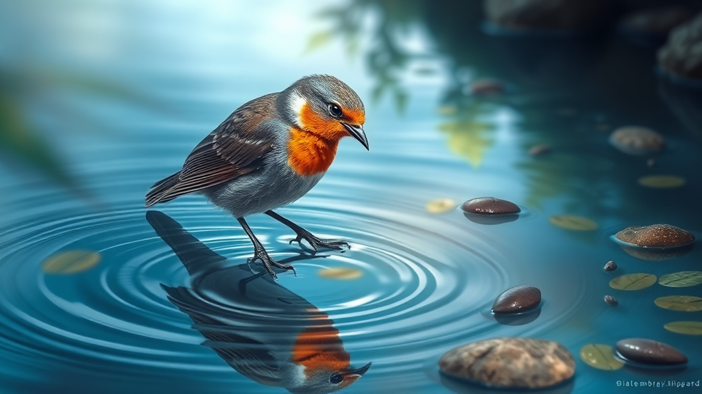 bird sipping water, vivid colors, realistic textures, serene atmosphere, enhanced detail, harmonious composition, natural setting, gentle lighting, peaceful mood, artistic rendering