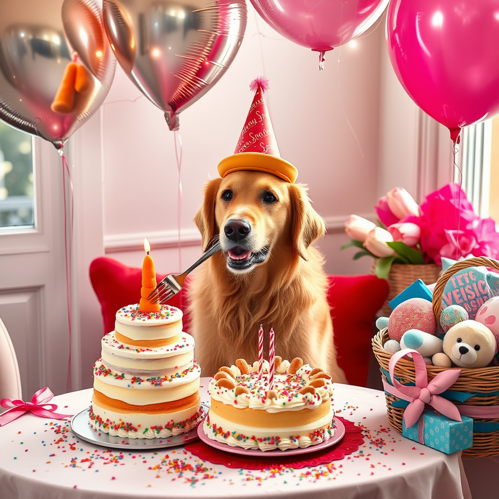 Birthday celebration of a delightful golden retriever, adorned with a tiny bowler hat and grasping a plastic fork in his mouth, perched on a cherry-red velvet cushion at a festive table spread with a towering carrot cake, puppy treats, and a scattering of colorful sprinkles. Balloons in shimmering silver and bright pink hues float above, entwined with twinkling fairy lights, while an assortment of wrapped gifts and plush toys overflow from a nearby present basket. Soft morning light spills through the window, casting a warm glow over the scene, and a sprinkle of festive confetti adds a playful touch to the cozy atmosphere.
