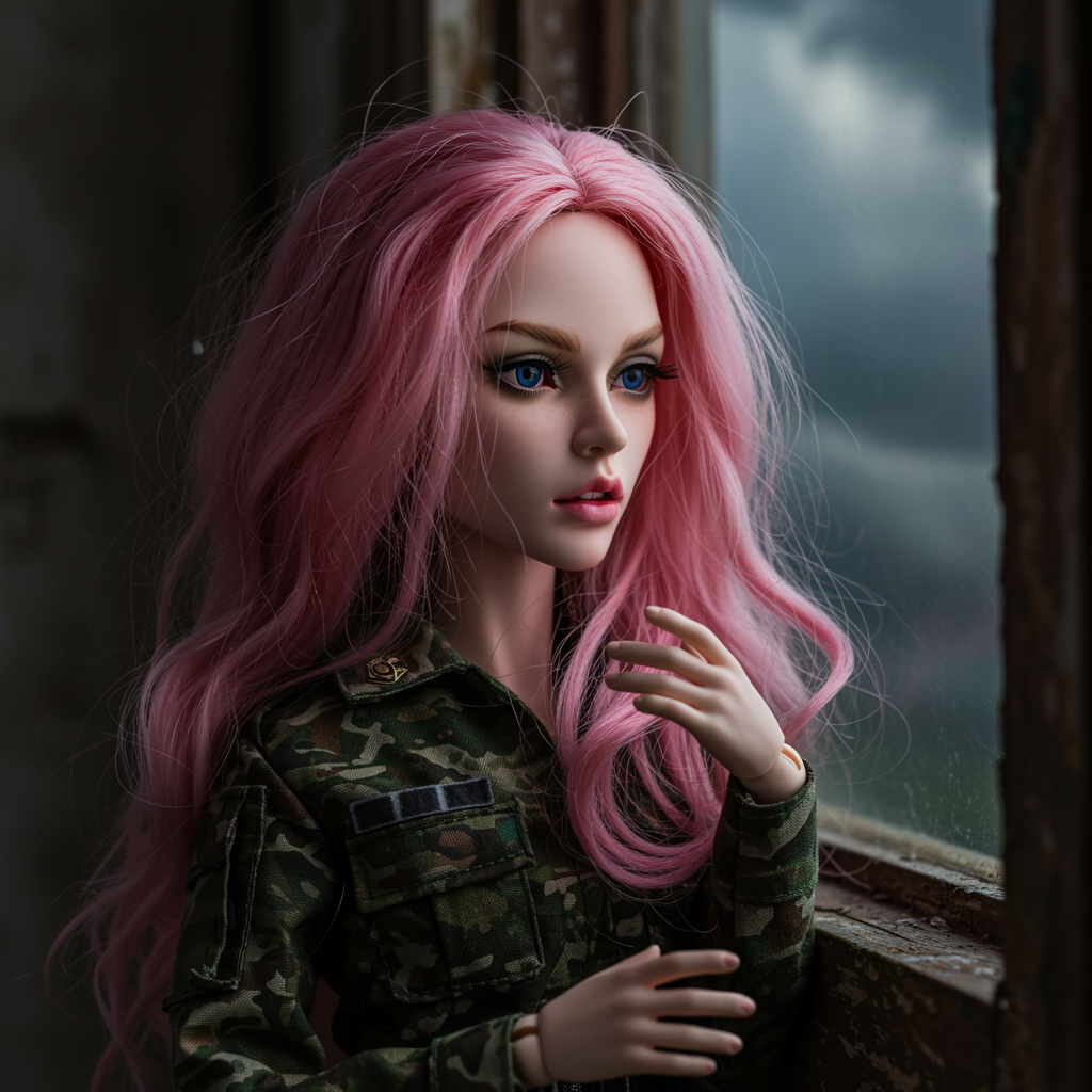 bjddoll, woman, intense mood, wild and disheveled, furious, beautiful yet chaotic, smooth features, pink and rainbow hues, absurdity in her expression, foolish yet smiling, military vibe, dressed in a sloppy manner, surprised and embarrassed, captured in a highly detailed moment, ultra realistic and hyperrealistic photography, gazing out a window, set against a stunning environment, old paint, brewing storm, a photo capturing the convergence of emotions and the surreal.