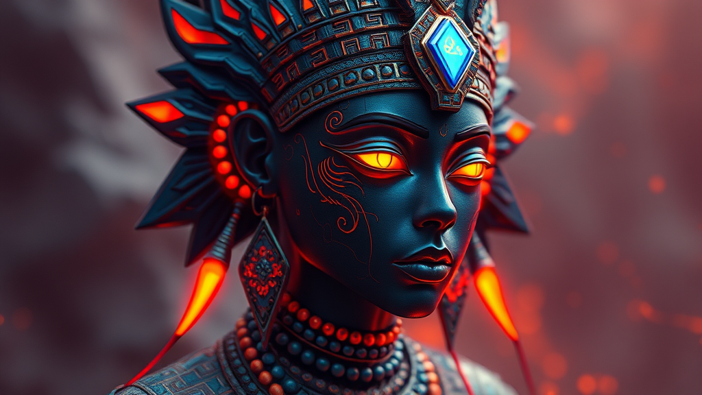 Bkllynbased artist Niksa Amira, crafting photorealistic 3D models that blend the essence of techno shamanism, infused with dark orange and azure hues. The artwork is heavily influenced by Egyptian iconography, weaving fantasy elements with oriental motifs and afrofuturism themes. The visuals are enriched with deep shades of azure and subtle flashes of red, creating an otherworldly yet culturally rich experience.