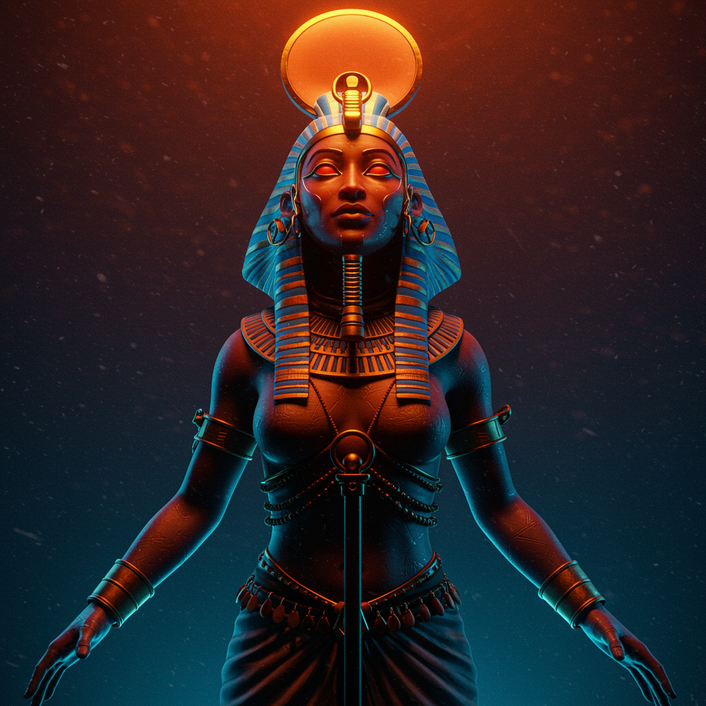 Bklynbased artist Niksa Amira, crafting hyper-realistic 3D models, blending the essence of techno shamanism with vibrant dark orange and cerulean hues. Infused with Egyptian iconography, the work is a fusion of fantasy and oriental influences, characterized by elements of afrofuturism, playing on the interplay of deep azure and vivid crimson tones.
