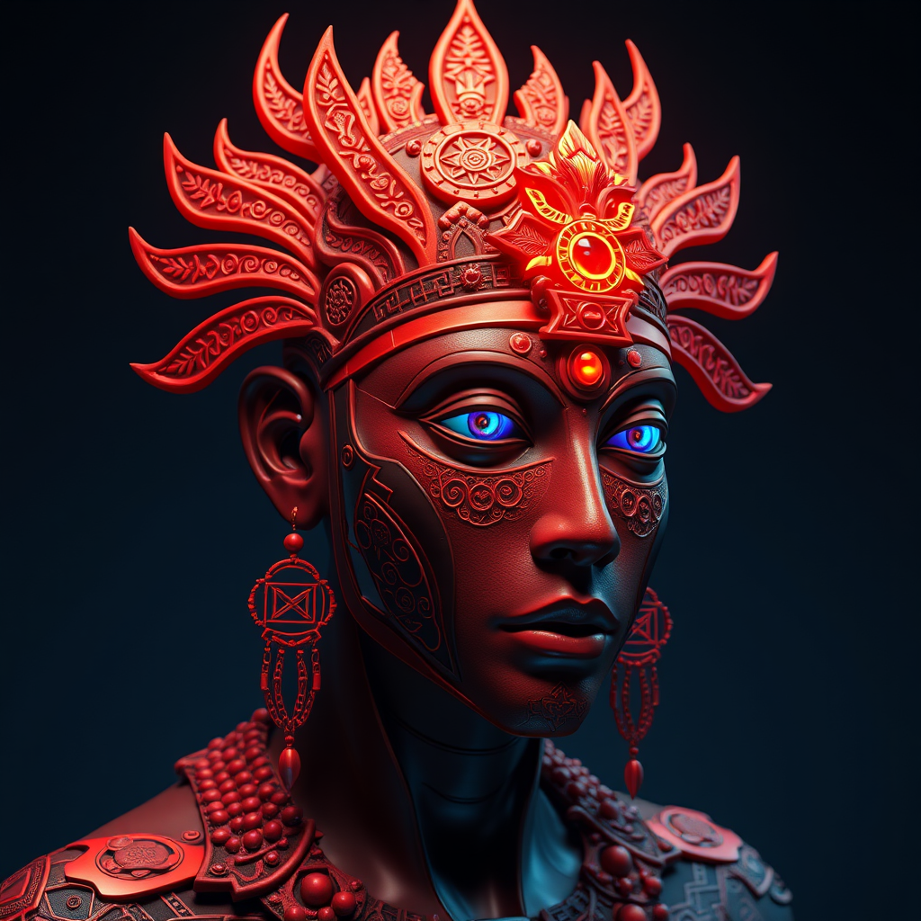Bklynbased artist Niksa Amira crafting ultra-realistic 3D models infused with techno shamanism, featuring a vibrant palette of dark orange and azure. Egyptian symbols intertwine with fantasy motifs, creating a tapestry of oriental aesthetics. Afrofuturism elements bring a futuristic edge, while deep azure and red hues add depth and contrast.