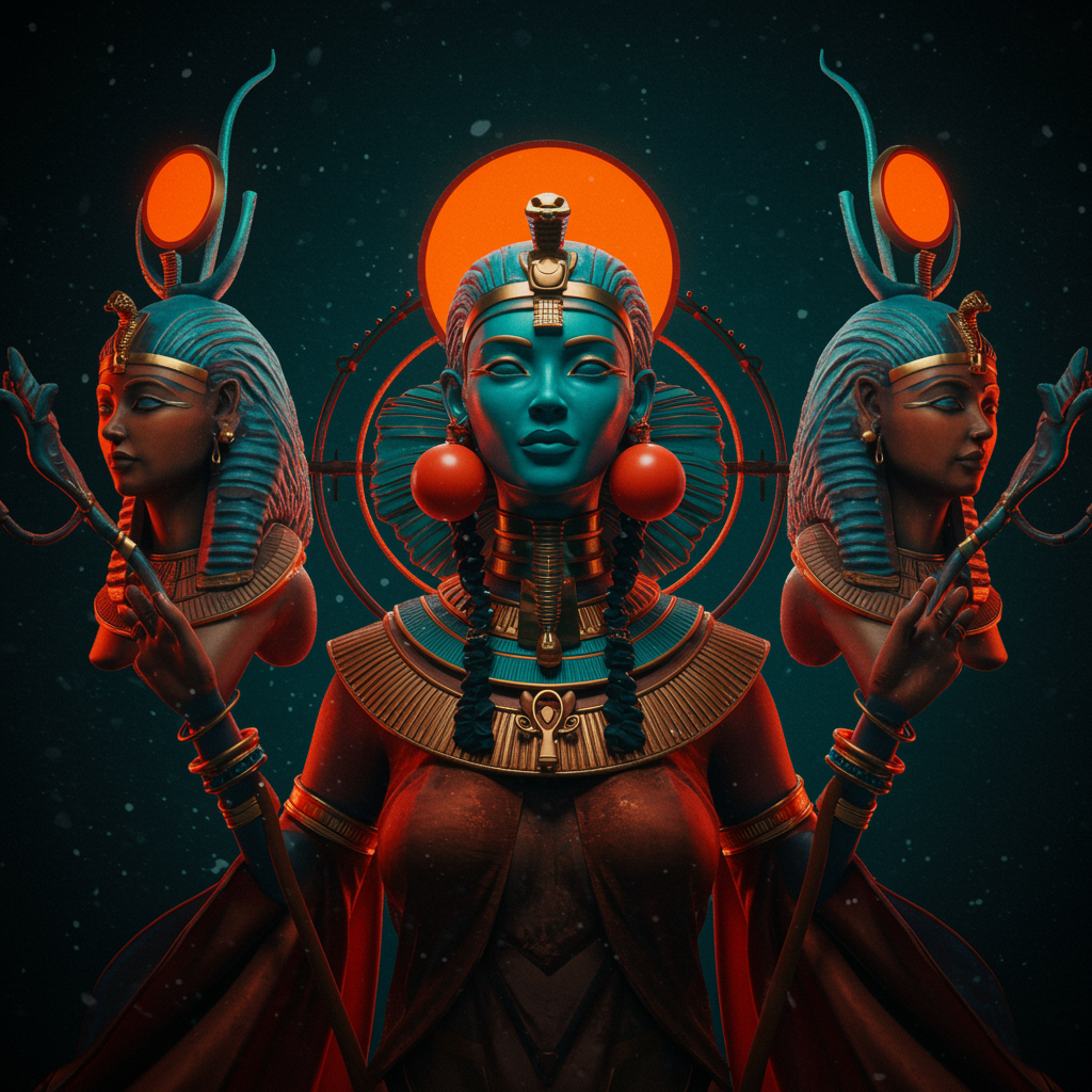 Bklynbased artist Niksa Amira designs photorealistic 3D models in a unique fusion style, merging elements of techno shamanism with dark orange and azure hues. These creations are deeply inspired by Egyptian iconography and fantasy themes, featuring oriental and afrofuturism influences. The color palette predominantly features rich dark azure and vibrant red, creating a striking and immersive visual experience.