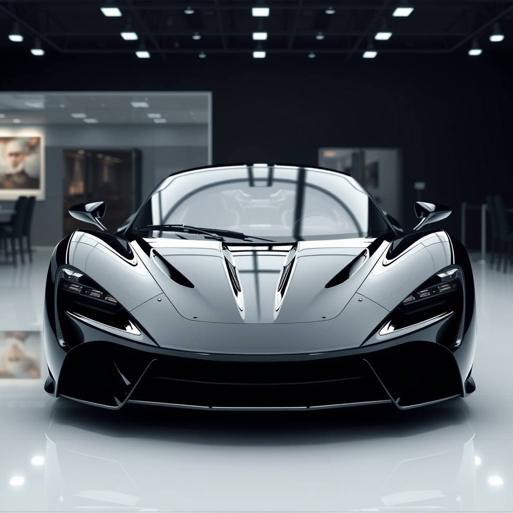 Black and silver trimmed 2023 supercar showcased in a sleek showroom setting, viewed from the front with showroom lights highlighting its elegant curves; utilizing Unreal Engine 5 for a photorealistic experience with 8k, 16k, and 4k resolutions; featuring stunning ray tracing and reflections for a hyper-realistic level of detail; vivid 1080p clarity captures every aspect of this masterpiece, allowing the futuristic design to truly shine.
