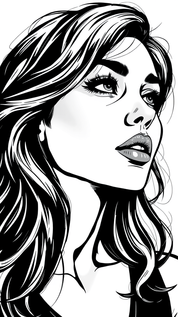 Black and white drawing of a woman, pop art-inspired comic book style, elements of Martin Ansin, featuring undulating lines and hyper-realistic details, reminiscent of Raymond Leech’s work, uses free brushwork with chiaroscuro akin to woodcuts, high stylization, aspect ratio 74:105, version 6, creatively capturing the essence with subtle modifications.