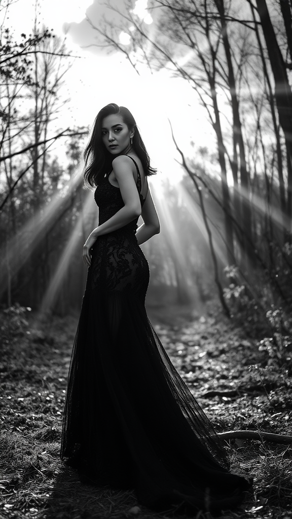 black and white fashion editorial photography featuring a stunning dark-haired woman wearing an elegant dark lace gown, set in a sun-dappled forest with beams of light filtering through the trees, under a dramatic sky, emphasizing contrasts of light and shadow with high-resolution, realistic detail captured from a cinematic perspective, enhanced by dynamic backlighting.