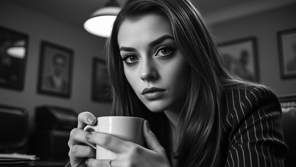 black and white film stock, high contrast, a captivating detective in the world, full-body movie clip, portrait, close up, eye focus, Noir 1940s detective woman, private investigator, sitting at a desk, cup of hot coffee, long hair, freckles, detailed symmetrical face, shiny hair, dark reflective eyes, makeup, slim figure, dust particles, detailed lighting, rim lighting, dramatic lighting, pinstripe trousers, ceiling lamp, depth of field, shallow focus, a sense of mystery and intrigue filling the air.