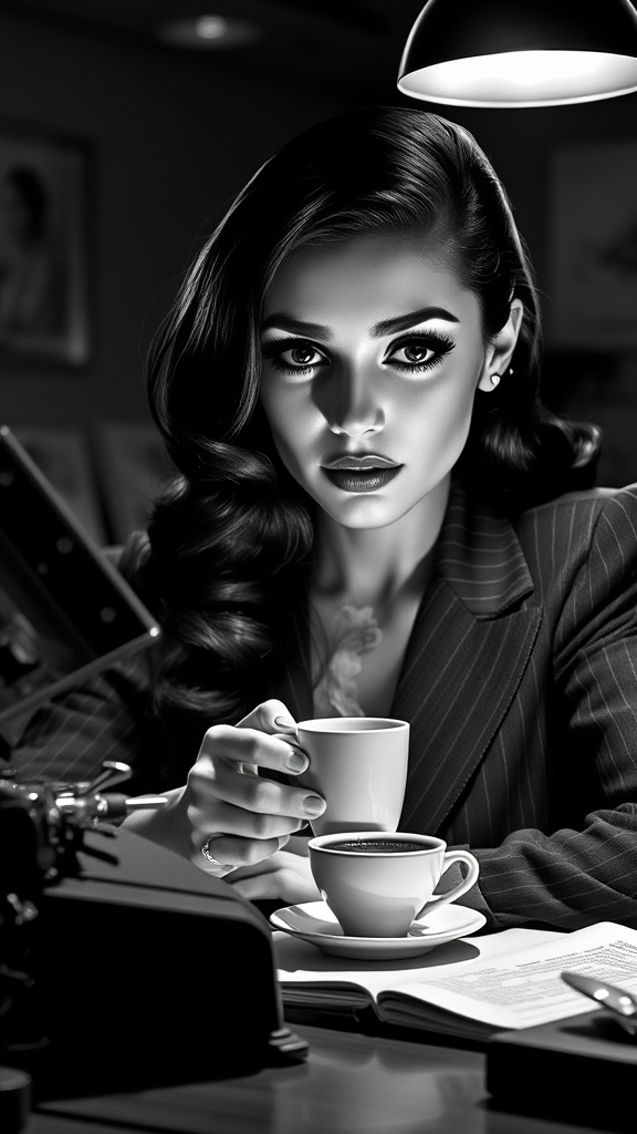 black and white film stock, high contrast, full body movie scene of the most stunning detective in the world, portrait, close-up, focus on eyes, Noir 1940's lady detective, private investigator, sitting at desk with a steaming cup of coffee, long shiny hair, detailed symmetrical face, dark reflective eyes, elegant makeup, slender physique, dust particles in air, intricate lighting, dramatic rim lighting, wearing pinstripe trousers, illuminated by ceiling lamp, black and white photography style, depth of field, shallow focus, classic typewriter and desk accessories, captured on canvas frame, subtle cartoonish touches, visually striking and artistic, maintaining allure and mystery of classic film noir atmosphere.