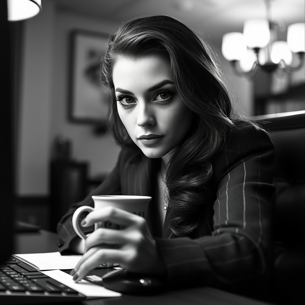 black and white film stock, high contrast, full body movie clip of the most beautiful detective in the world, portrait, close up, eye focus, Noir 1940's detective woman, private investigator, sitting at a desk, cup of hot coffee, long hair, freckles, detailed symmetrical face, shiny hair, dark reflective eyes, makeup, slender, dust particles, detailed lighting, rim lighting, dramatic lighting, pinstripe trousers, ceiling lamp, black and white photography, depth of field, shallow focus, keyboard, mouse, elegant, refined proportions, artistic composition, maintaining realism and classic charm without distortion or exaggeration.