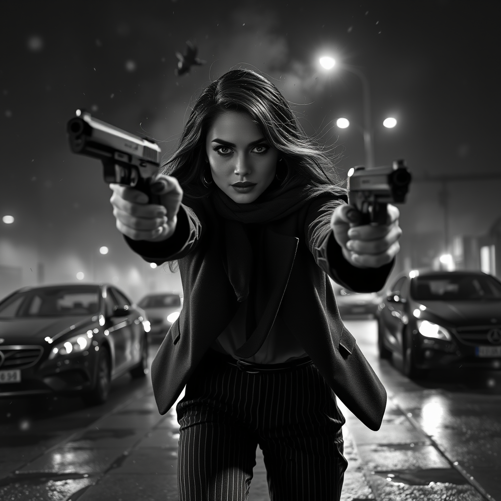 Black and white film stock, high contrast, full body movie clip of a gunfight action scene, beautiful face, Noir 1940s detective woman dodging gunshots, shattering glass, long shiny hair, dark reflective eyes, makeup, skinny, mist, fog, wet pavement, dust particles, detailed dramatic lighting, rim lighting, pinstripe trousers, street lights, black and white photography, depth of field, shallow focus, tweed, modern cars, keyboard, mouse, canvas frame, cartoon aspects, 3D elements, subtle colors, clear visuals, artistic focus on face and hands, composed frame, balanced proportions, professional art style, detailed anatomy, perfectly framed, clear-eyed, complete figures in frame, precision in features, realistic render.
