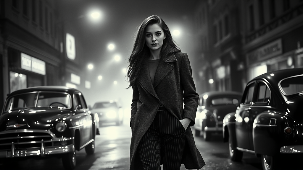 Black and white film stock, high contrast, full body movie clip of the most beautiful detective woman in the world, close up, Noir 1940's detective woman walking down a 1940's street, long hair with shine, freckles adorning her face, dark reflective eyes, skillfully applied makeup, slender figure enveloped in mist and fog, surrounded by dust particles, intricately detailed lighting with dramatic effect. Rim lighting accentuates her form, dressed in pinstripe trousers, illuminated by street lights characteristic of black and white photography, showcasing depth of field and shallow focus. Wearing a tweed coat, she stands amidst classic and modern cars. Her confident stride, framed within a cinematic moment, captivates the viewer, capturing the essence of the timeless elegance and mystery inherent in the classic noir tradition.