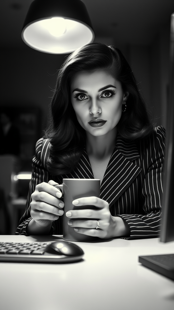Black and white film stock, high contrast, full body movie clip of a stunning 1940s noir detective woman, portrait, close-up, eye focus, private investigator sitting at a desk with a cup of hot coffee, long shiny hair, detailed symmetrical face, dark reflective eyes with exquisite makeup, slim figure, dust particles visible in detailed rim and dramatic lighting, wearing pinstripe trousers, a ceiling lamp casting shadows, black and white photography with depth of field and shallow focus, a vintage keyboard and mouse on the desk, framed in an artistic composition.