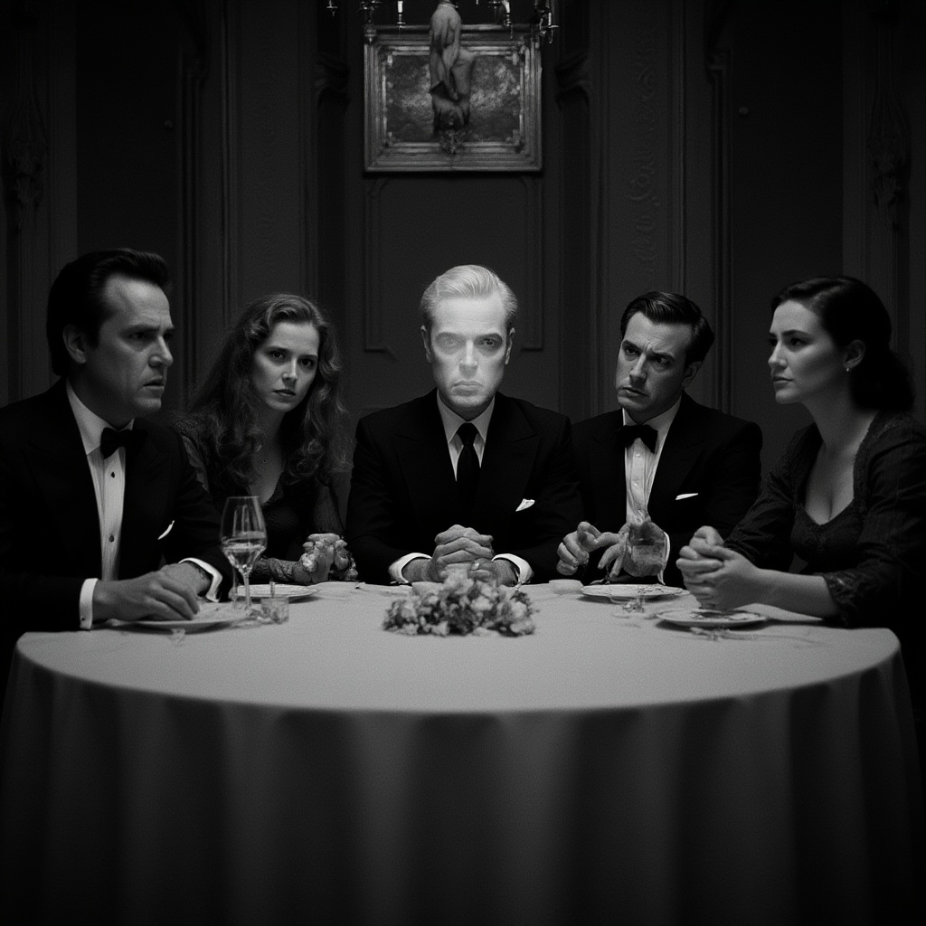 A somber black-and-white image captures a group of elegantly dressed men and women seated around a grand table, seemingly engrossed in a formal gathering. However, at the center, one man's face is inexplicably obscured, as if by an ethereal mist or a deliberate smudge, and the others around him shoot furtive, anxious glances his way, creating an atmosphere charged with mystery and unease.