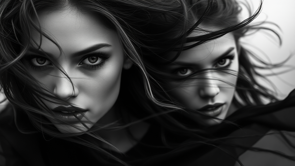 Black and white photograph capturing women in motion, intense gazes, haunting beauty, richly textured layers, expressive and soulful eyes, with jagged edges and western portrait influences, featuring a loose and fluid style, evoking a sense of timeless elegance and powerful emotion.