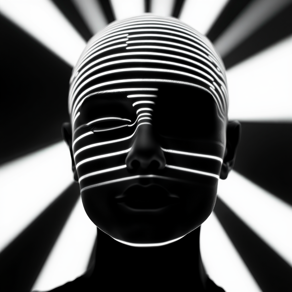 Black and white photograph of a face with linear patterns, the head composed of illuminated stripes, embracing a minimalistic and graphic artistic style, capturing contrast and form with a touch of creative abstraction.