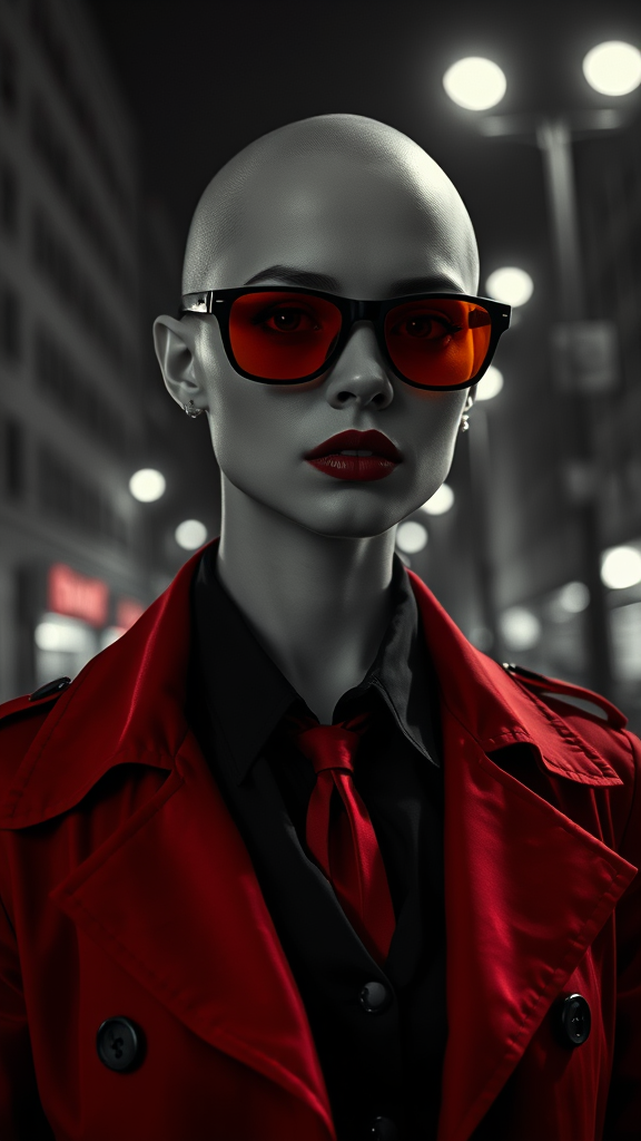 Black and white photograph of a female vampire from Clan Tremere, showcasing a strikingly beautiful face with no hair, wearing a stylish red trench coat over a black buttoned-up shirt and a red necktie. She sports sunglasses with orange lenses. Set against a city at night, the scene is well-lit by streetlights. Her face is detailed and symmetrical, exuding a film noir aesthetic. Her lifelike appearance is emphasized with real skin textures, highlighting intricate details like pores and matte skin, enhanced by soft lighting and subsurface scattering. The atmosphere is realistic with heavy shadows contributing to the photorealistic and hyper-detailed quality, creating a masterpiece reminiscent of film photography in full sharp focus. Despite the creative modifications, such as a focus on intricate textures and lighting, the essence of a living vampire in a hyper-realistic urban night scene is maintained.