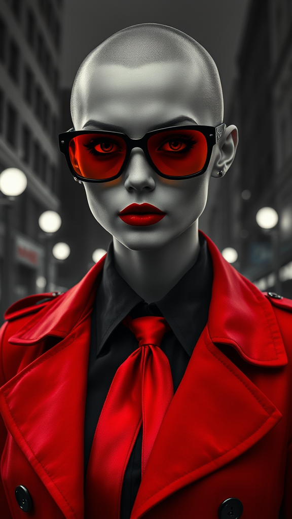 Black and white photograph of a striking female vampire from Clan Tremere, featuring a captivating and symmetrical face. She is bald, enhancing her unique beauty, and dressed in a stylish red trench coat paired with a sleek black buttoned shirt and a bold red necktie. Her eyes are concealed behind sunglasses with vivid orange lenses. The city nightscape serves as the backdrop, illuminated by streetlights, embodying the essence of Vampire: The Masquerade. Her appearance is hyper-realistic, with intricate skin details such as pores and matte textures, brought to life with soft lighting and subsurface scattering. The atmosphere blends elements of film noir with a focus on heavy shadow, resulting in a masterpiece of photorealism. The image boasts an impressive 8k resolution, capturing the golden ratio and intricate film photography, with perfect sharpness and soft focus, while deliberately avoiding elements like NSFW content, nudity, logos, watermarks, blurs, text, poor quality art, cartoonish or 3D render styles, and keeping the composition elegantly framed within realistic and artistic boundaries.