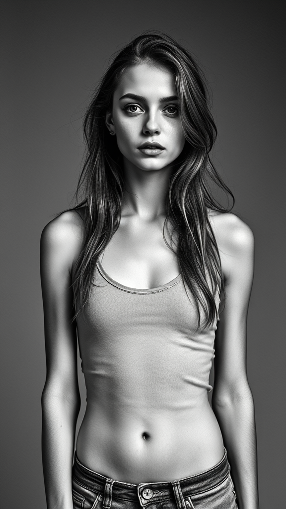 Black and white photograph of a young woman in a tank top inspired by Alasdair McLellan's style, showcasing a slender, Ukrainian model with sweat glistening on her skin. She has a tomboyish allure, with pretty long hair reminiscent of Julia Garner, captured in a full-page periodical image like a daguerreotype. The full-length shot emphasizes her supermodel stature against a flat grey backdrop, presenting an archived photograph aesthetic.
