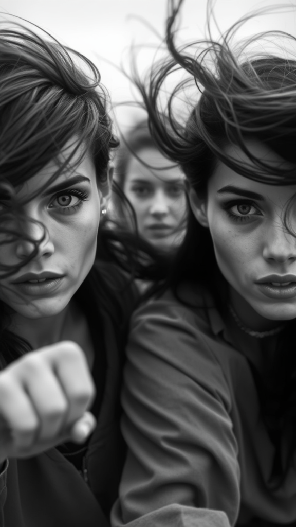 Black and white photograph of women in motion, capturing a sense of urgency and freedom, their intense gaze cutting through the frame, hauntingly beautiful with richly layered features. The expressive eyes tell stories of strength and resilience, framed by jagged edges that create dynamic tension. The composition echoes western-style portraits, yet flows with a loose and fluid style that adds an ethereal quality, pulling the viewer into their world.