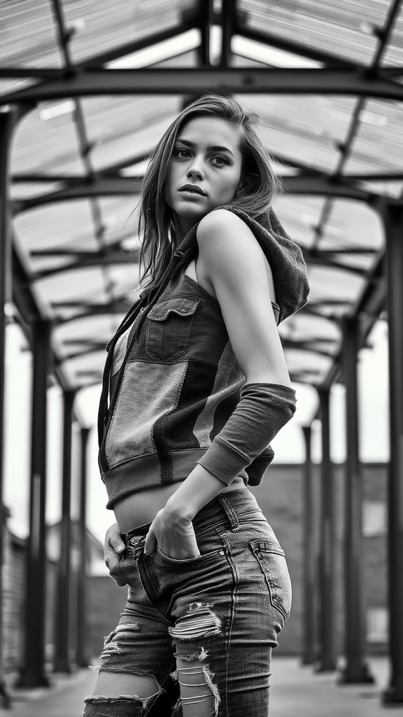 Black and white photography, deconstructivist fashion shot from a distance, featuring a 24-year-old Fulani-Chechen female swimmer with an expression of curious wonder. Her body is elegantly sculpted, with firm arms, tight, smooth skin, and toned muscles. Her complexion is fair with a natural sheen, reflecting light softly, and her skin pores and texture are in sharp focus. She has shield-shaped, pale grey eyes framed by long eyelashes and curved, bushy eyebrows complementing her delicate features. She wears a layered, patchwork hoodie with exposed zippers and reveals a hint of midriff, paired with distressed jeans featuring uneven cuts. Her body is elegantly turned, with one hand casually in a pocket. The composition follows the rule of thirds, with fractured metal columns supporting an abstract roof in the background, capturing the style of Viviane Sassen with an unknown twist.