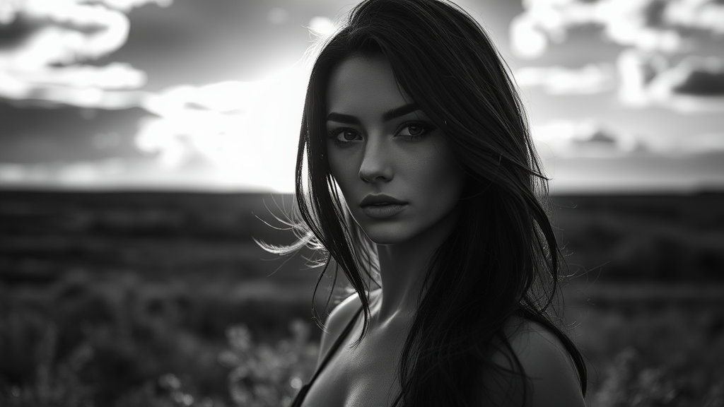 Black and white photography, fashion editorial style, a portrait of a stunning dark-haired woman in a natural setting, with a dramatic sky in the background, interplay of light and shadows, high-resolution, realistic imagery, expert photography, cinematic perspective, dynamic backlighting illuminating the scene.