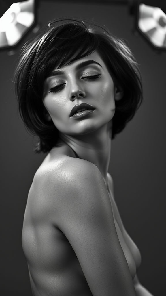 Black and white photography of a fashion editorial portrait showcasing a stunning nude woman with dark short hair, her eyes gently closed under studio lights. The high-resolution, realistic image captures the essence of professional photography with a cinematic angle and dynamic backlighting that highlights her serene expression and elegance.