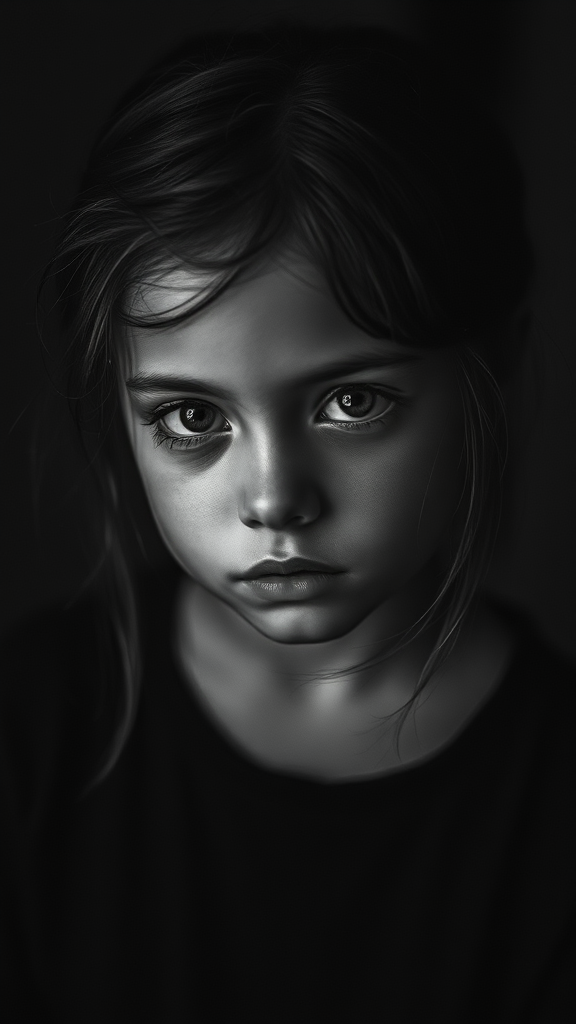 black and white portrait of a young girl, exuding a somber yet captivating aura, masterfully blending dark atmospheric tones with hyper-realistic details, reminiscent of hasselblad 500c/m imagery. infused with a hint of carnivalesque mystique, bathed in ethereal golden light, rendered in ultra-high definition quality, echoing the precision of a sony alpha a1 camera. aspect ratio set to 69:128, delivering a mood of depth and intrigue.