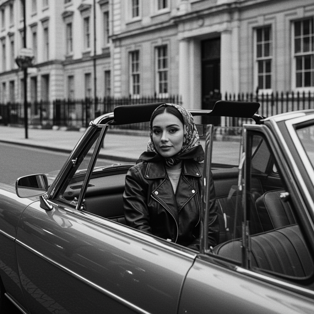 Black and white street photography capturing an elegant woman in a leather jacket paired with a stylish headscarf, seated confidently inside a classic convertible on London's bustling streets, shot by arriflex 35 BL Camera using Canon K35 Prime Lenses, with an aspect ratio of 1:2 and enhanced stylization at a level of 750, the scene exudes timeless charm with a hint of modern flair as her gaze meets the lens against the backdrop of iconic London architecture.