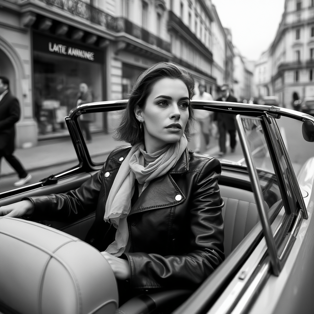 Black and white street photography of a sophisticated woman in a leather jacket and silk scarf, poised elegantly inside a classic convertible cruising through the historic streets of Paris, captured with a Leica M3 and Summilux lenses showcasing a timeless charm and a hint of adventure, cinematic and stylish with a touch of grace.
