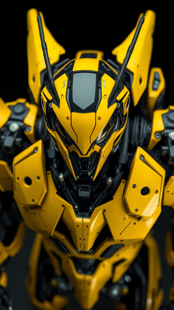 Black and yellow battle mech with intricate design, featuring a stunning sci-fi mask and reflective yellow body, complemented by a jetpack. Insectoid-inspired sci-fi combat mech showcasing incredible detail and adorned with bright yellow polymer armor elements, showcasing identifying marks. The inside machinery is visible through natural textures and reflections, set against an eerie black background. The top-down view and dramatic staging emphasize the mech's presence with cinematic shooting, resulting in an ultra-high resolution, photorealistic 8k rendering. The piece captures the essence of hyper-realism with Rembrandt lighting, delivering stunning quality and ultra-high shutter speed. The neutral, blurred background heightens contrast and focus on the mech, ensuring a clean, uncluttered visual showcasing a masterful blend of sci-fi and artistic excellence.