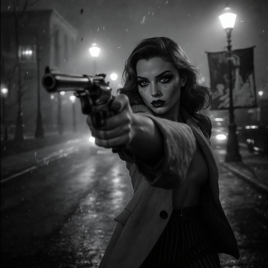 View this AI-generated image featuring black and white film stock high contrast full body movie clip of a gunfight action scene beautiful face arm out extreme close up noir 1940s detective woman aiming a colt revolver long hair freckles shiny hair dark reflective eyes makeup skinny mist fog wet pave