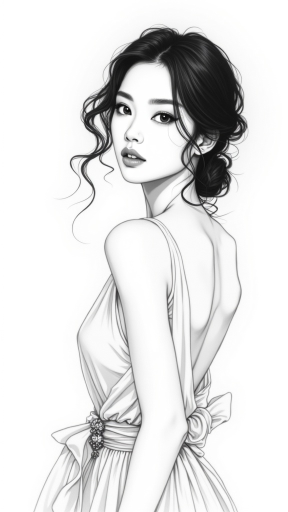 View this AI-generated image featuring a detailed black and white illustration of a stunning korean woman with expressive features set against a plain white background accentuating the elegance and grace in her posture while incorporating subtle creative elements that add a unique flair to her expre