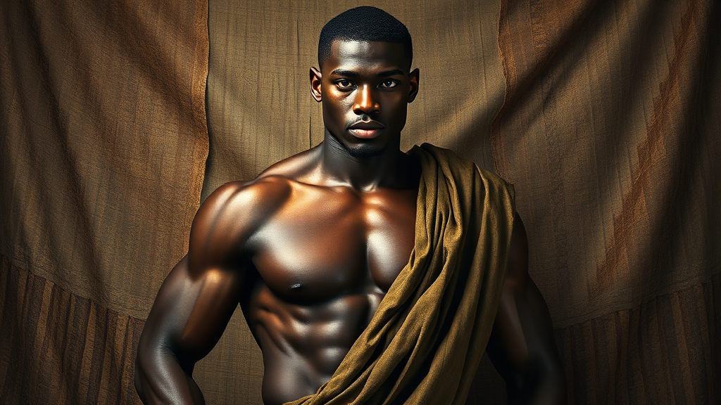 Black man draped in weathered cloth, showcasing a muscular and strikingly handsome physique set against an intricately detailed backdrop, lifelike and realistic, featuring a finely detailed face illuminated by crisp natural lighting with vibrant yet natural colors, rendered in photorealistic 8k quality, evocative of a trending masterpiece on Tumblr, inspired by the artistic styles of Artgerm, Greg Rutkowski, Alphonse Mucha, Loish, and WLOP, with subtle creative flourishes enhancing the overall composition.
