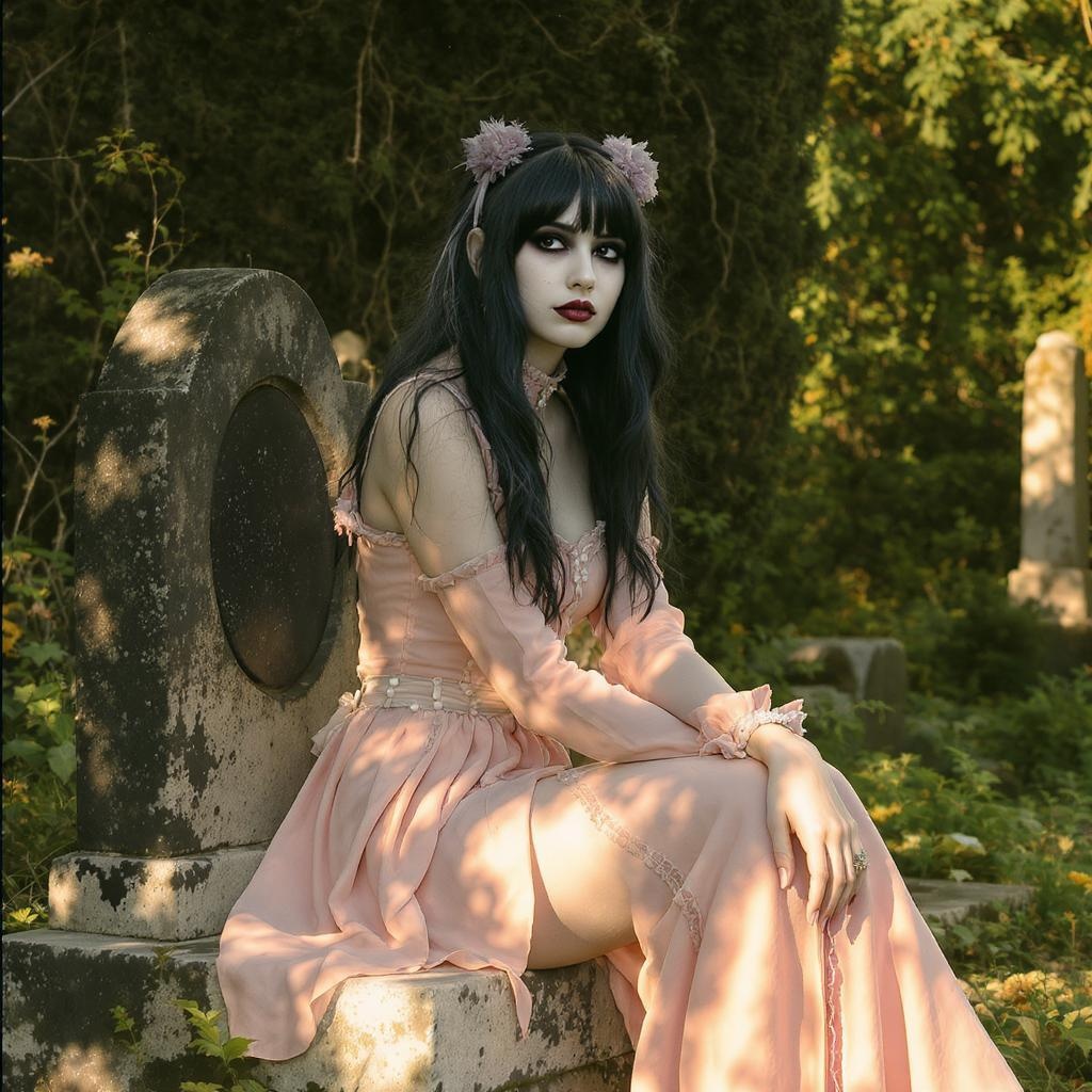 Black metal inspired pastel goth in pale pink attire sitting gracefully on a weathered tombstone, intense side-cast sunlight accentuating her ethereal features, skin glowing gently in the golden light. She gazes thoughtfully into the distance, her dark eye makeup creating a captivating contrast against her delicate complexion. Her long hair cascades down her back, adding an air of mystery. Kodak Portra 800 film captures the scene with a soft, nostalgic warmth, the setting surrounded by an ancient cemetery enveloped in lush greenery. While maintaining her intense persona, her look is softened by the absence of eyebrows, emphasizing her otherworldly charm. Portrait ratio.