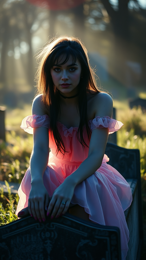 Black metal inspired pastel goth sitting on a tombstone, dressed in pale pink, intense sunlight casting dramatic shadows across her face, no eyebrows, surrounded by a mystical aura, vibrant contrast, enhanced detail, kodak portra 800, 9:16 aspect ratio, ethereal and haunting yet soft and delicate.