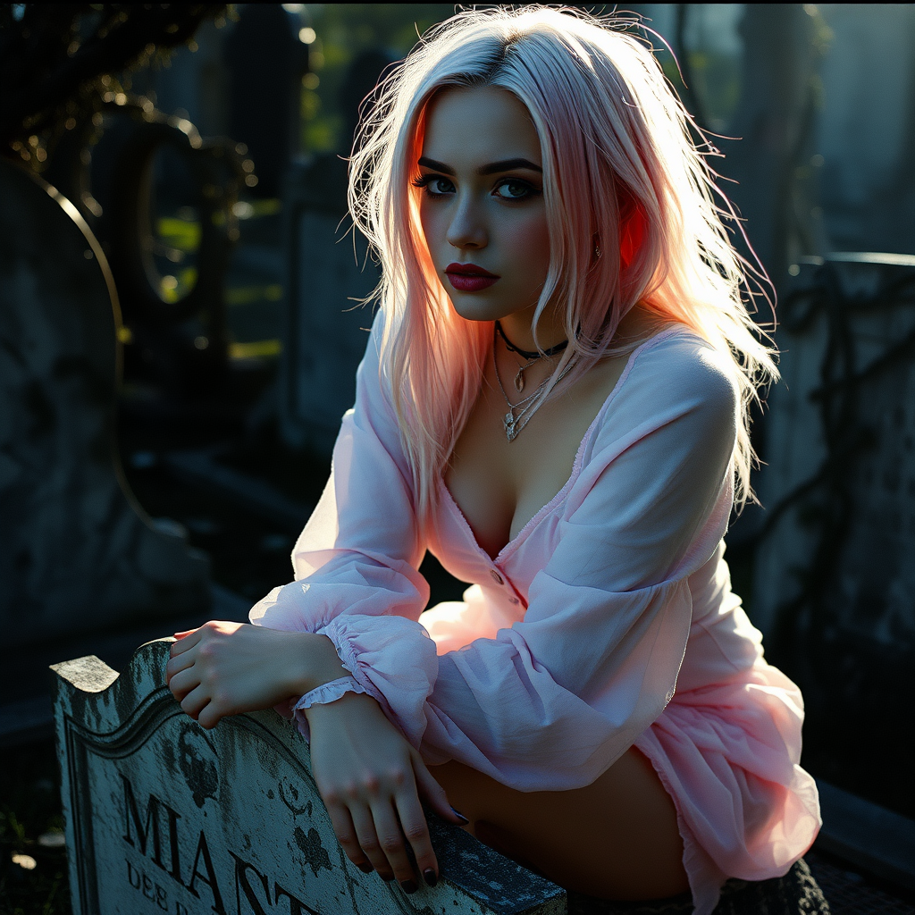 Black metal inspired pastel goth woman with pale pink hair sitting on a weathered tombstone, intense sunlight casting dramatic shadows on her face from the side, her eyes are dark and striking, set against the soft pastel tones of her outfit, no eyebrows, surrounded by a background of overgrown vines and faded gravestones, kodak portra 800 aesthetic, creating a haunting yet ethereal atmosphere, vivid contrasts between light and shadow enhance the surreal quality of the scene.