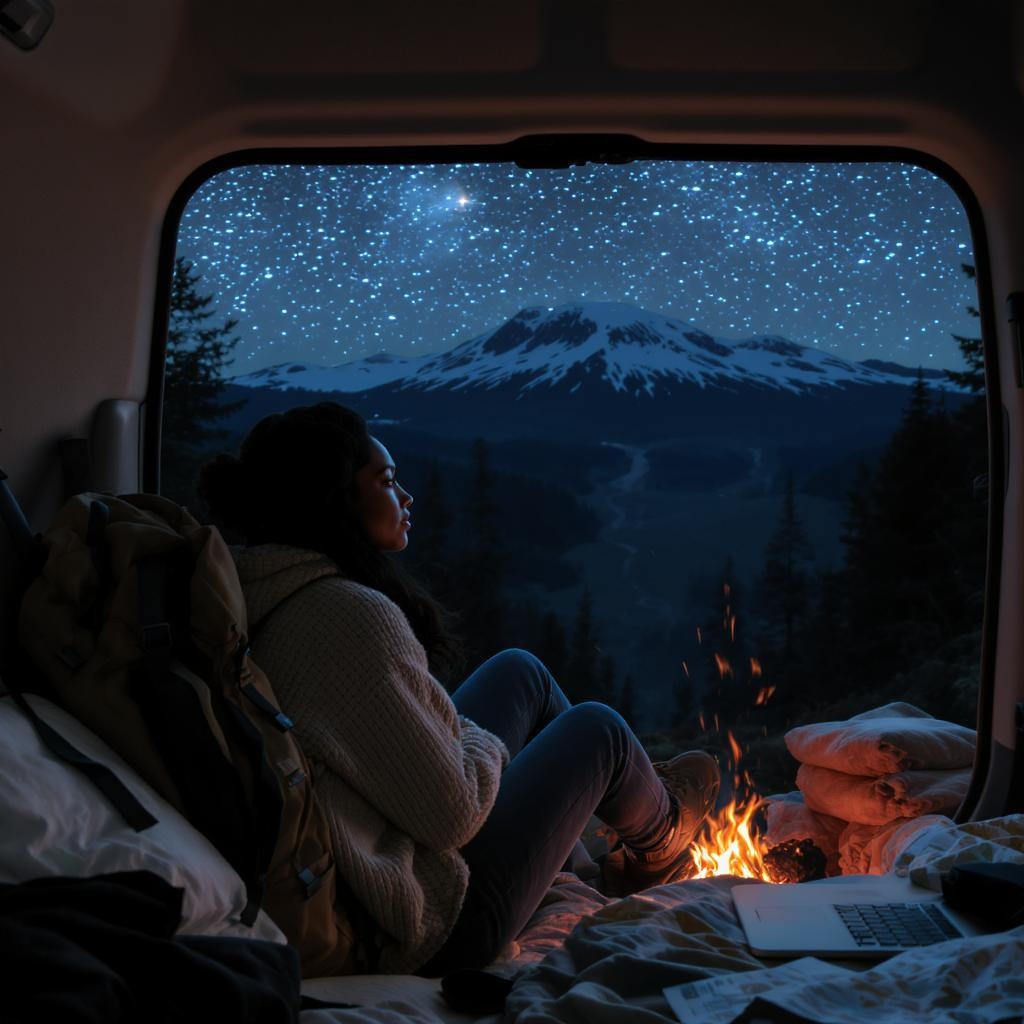 A 30-year-old black woman sits in the back of her van, her eyes captivated by the breathtaking peaks of the Olympic mountain range. The night sky twinkles with stars, and the forest hums with life around her. Itβs a serene setting, yet she feels a mix of awe and anticipation for what lies ahead on her journey. As she tends to the fire's embers, a sudden breeze sends chills down her spine, reminding her of the solitude surrounding her. With determination, she takes stock of her supplies and contemplates her next steps, pondering what discoveries await and what obstacles she might face. Amidst the tranquility of vanlife, she reflects on her path and the future she seeks to uncover, capturing this moment trending on Instagram without the chaos of imperfections.