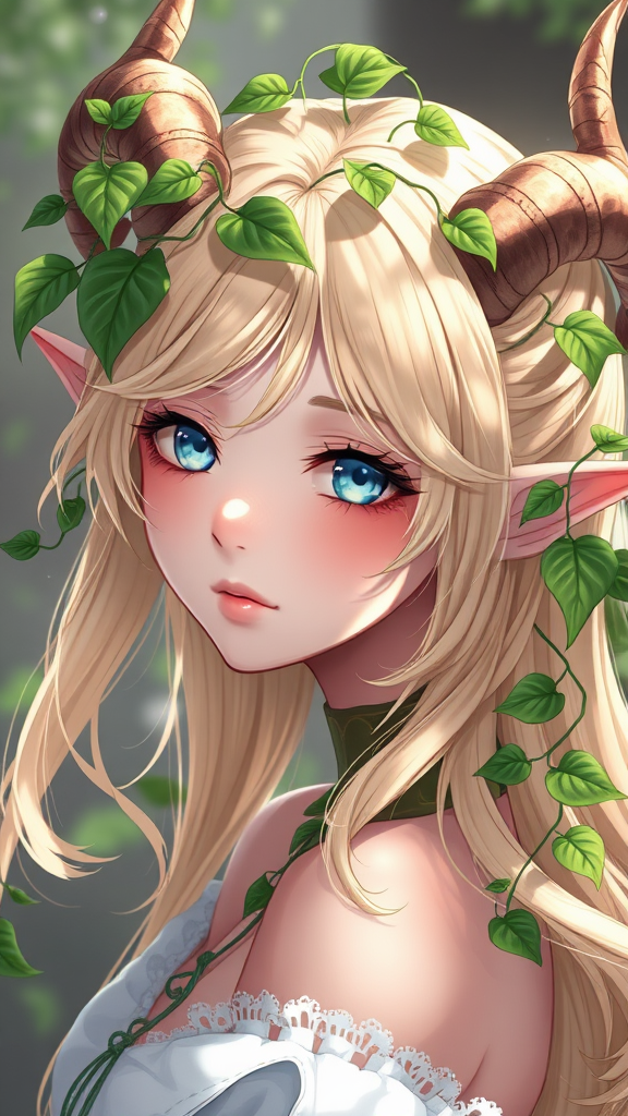 Blond-haired girl with elegant horns and intertwining green leaves adorning her head, captured in a detailed digital anime style inspired by the artistry of Loish and WLOP, exuding an enchanting charm akin to a cute digital painting. Envision an elf girl's ethereal essence translated into a digital anime illustration, echoing fanart of the highest caliber on ArtStation, with influences from the styles of WLOP and Guweiz. Picture a hyperdetailed fantasy character brought to life with anime-styled 3D effects, capturing her otherworldly beauty and mythical allure, while incorporating subtle playful adjustments to her features and attire for a refreshing twist on the original concept.
