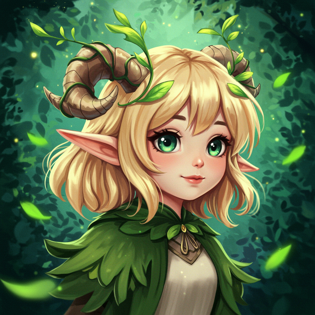 Blond haired girl with graceful horns entwined with vibrant green leaves, crafted in highly detailed digital anime art style, drawing inspiration from artists like loish, wlop, and guweiz. She embodies a whimsical elven charm, her large, expressive eyes glistening with a hint of mischief. Her ethereal, delicate features are accentuated by a soft luminescent glow, evoking a sense of enchantment. An exquisite digital painting capturing a fantasy character within a dreamlike forest setting, echoing the allure and intricacy found in the finest artstation fanart. Hyperdetailed and anime-styled with a 3D feel, the portrayal is both adorable and captivating, with an aura of serene beauty and mystique.