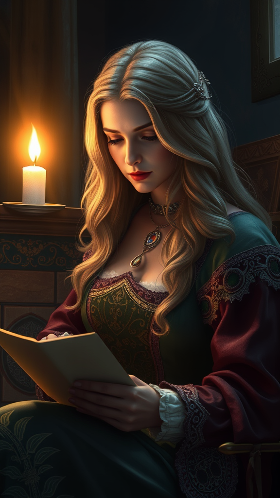 Blond woman in a medieval gown, immersed in writing a letter by candlelight, surrounded by an aura of mystical glow, fantasy artwork behance, ethereal fantasy concept art portrait, inspired by wojtek fus, akin to ciri in grace, echoes of graphic artist magali villeneuve, rich 4k fantasy art, reminiscent of fanart on top artstation, set within the witcher universe, captivating epic fantasy art portrait, dynamic fantasy art style, reminiscent of fantasy game art aesthetics, enchanting fantasy genre portrait, breathtaking character art.